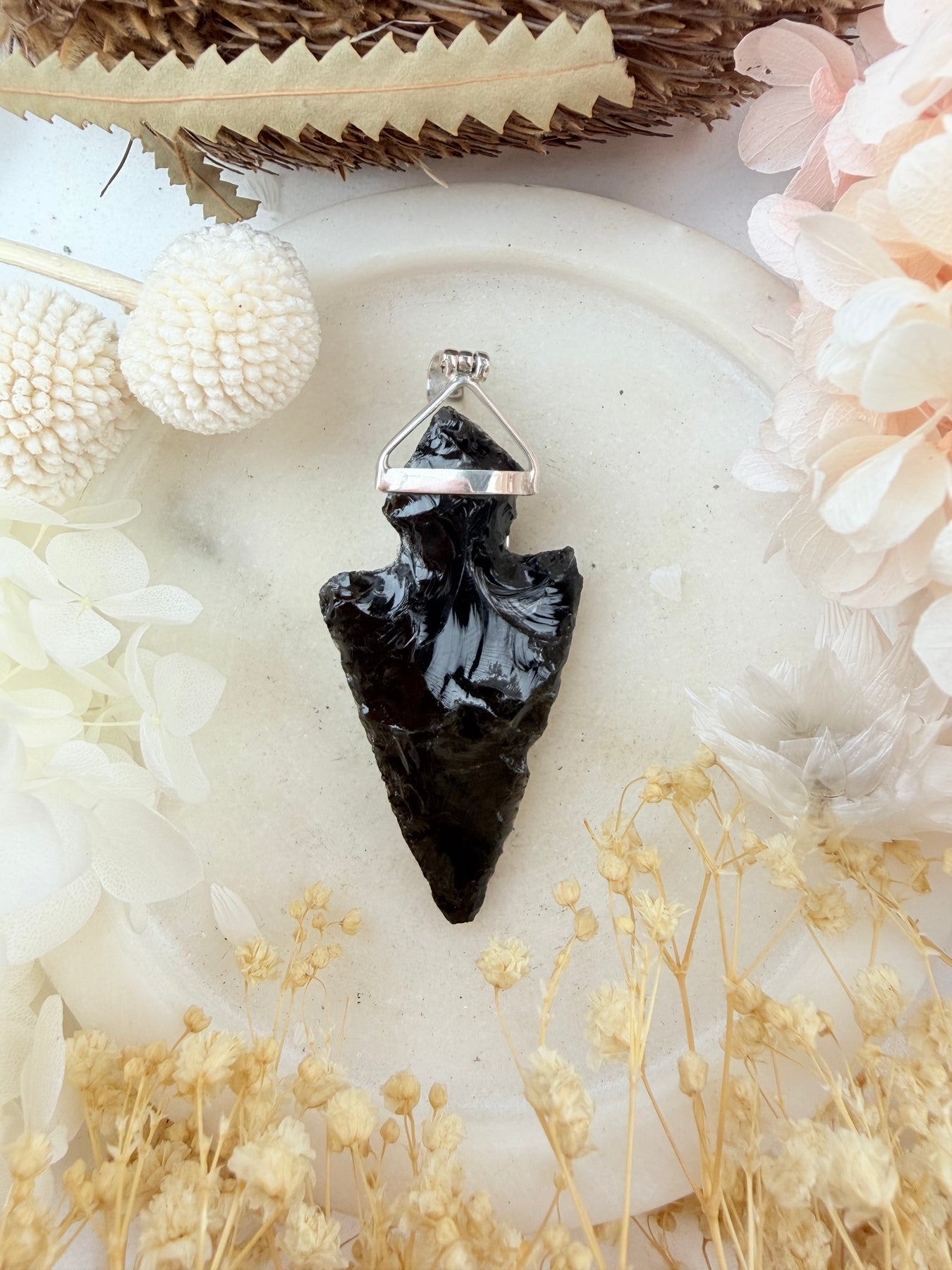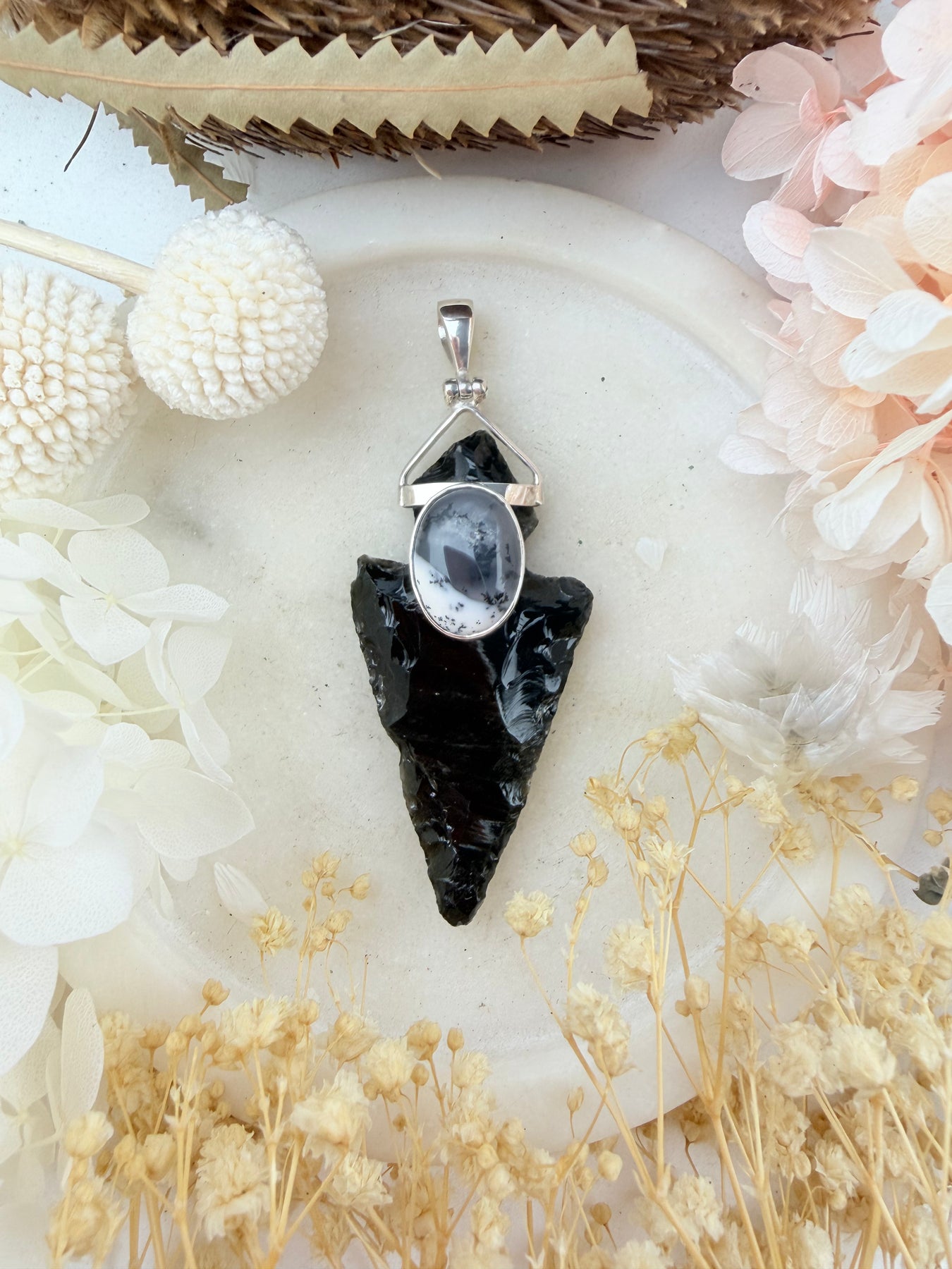 Handmade with love in Black Obsidian Arrowhead & Merlinite set into sterling silver 925