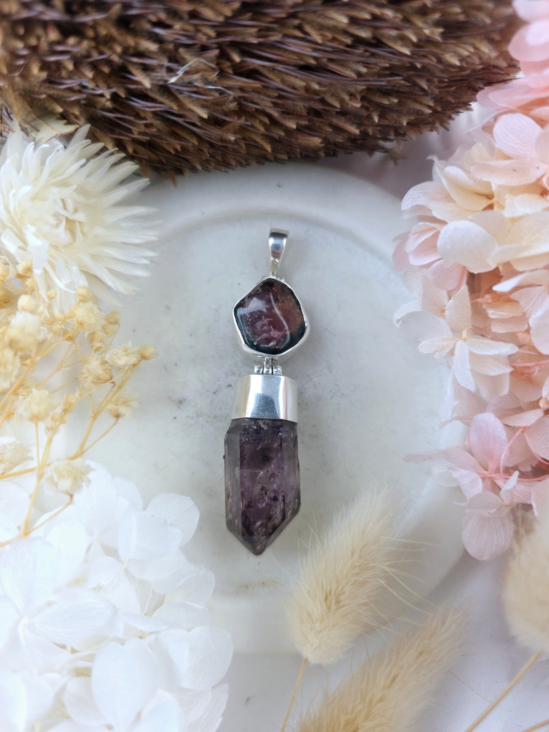 Brandberg Amethyst Enhydro (Non-Moving Bubble) & Watermelon Tourmaline Silver Pendant