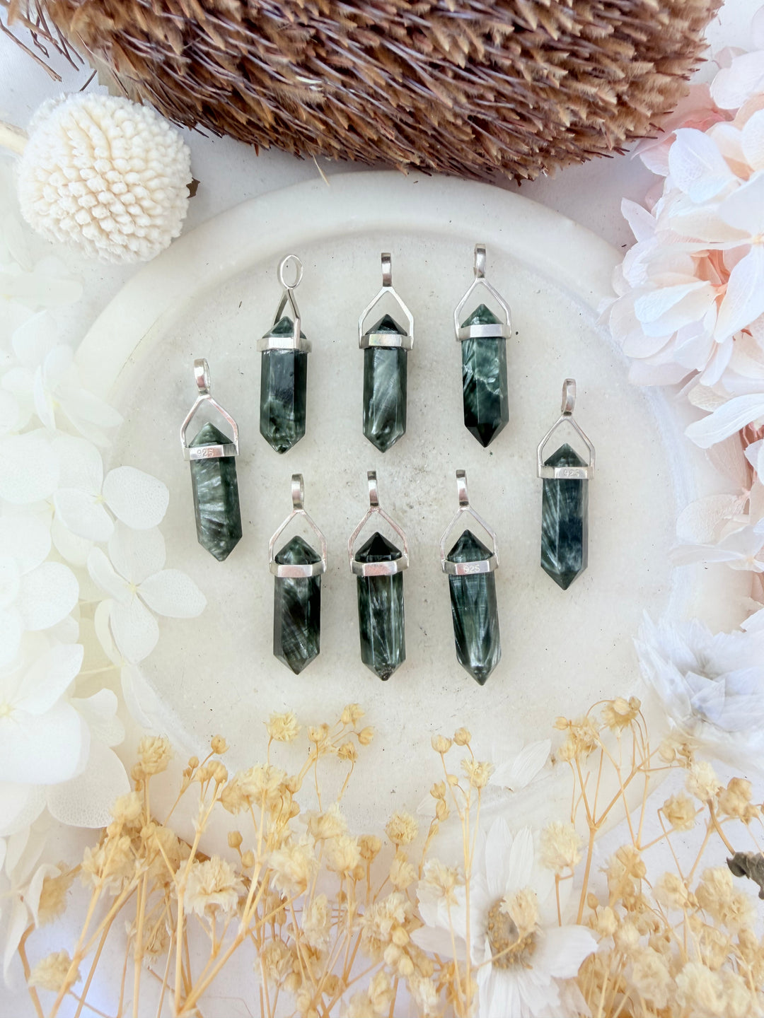 Prehnite with Epidote & Black Tourmaline Tumbled Silver Pendant