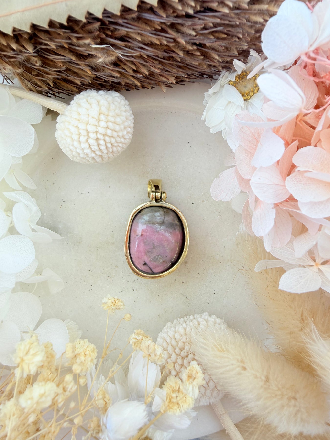 Hand crafted with rhodonite and set in brass