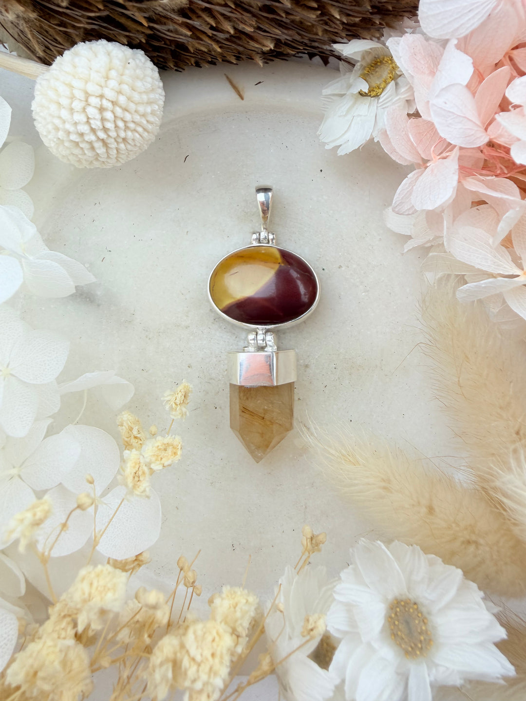 Golden Rutile Quartz & Mookaite Jasper Silver Pendant